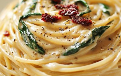cKremete spaghetti med spinat og soltørkede tomater 👨👩👧👦 Porsjoner: 2 ⏱️ Tilberedningstid: 10 minutter ⏱️ Koketid: 15 minutter 📝 Ingredienser…